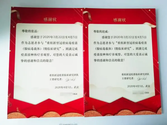 △ 新冠疫苗臨床研究團(tuán)隊給張晶夫婦頒發(fā)的“感謝狀”