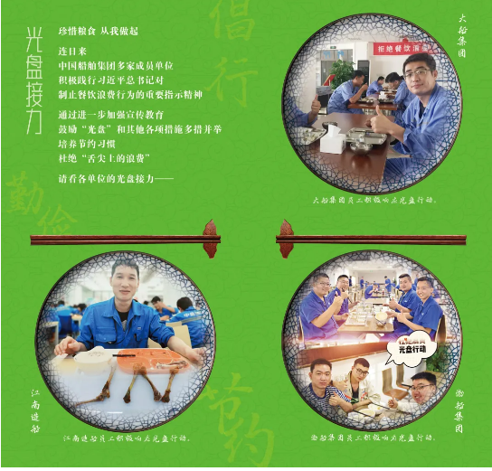 為認真貫徹落實習近平總書記關于制止餐飲浪費行為的重要指示精神,大力弘揚中華民族勤儉節(jié)約、珍惜糧食的文明用餐習慣,中國船舶集團積極開展“制止餐飲浪費 踐行光盤行動”專項宣傳引導活動。