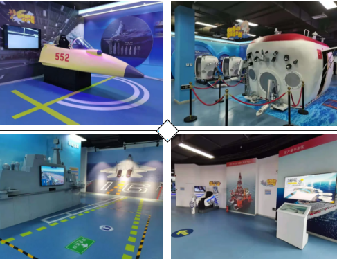 整個(gè)展館內(nèi)分布著護(hù)航體驗(yàn)區(qū)、VR綜合體驗(yàn)區(qū)、航母艦室漫游體驗(yàn)區(qū)、近海VR鉆井平臺(tái)體驗(yàn)區(qū)、艦載機(jī)起飛體感指揮體驗(yàn)區(qū)、航母艦載機(jī)空體驗(yàn)區(qū)等,可以讓參觀者模擬駕駛我國(guó)船海重器,親身感受搏浪滄海、護(hù)衛(wèi)海疆的震撼與自豪,使得船舶館成為海洋特色鮮明、模型館藏豐富、互動(dòng)體驗(yàn)感強(qiáng)的軍事科普教育展館和軍事文化娛樂園區(qū)。