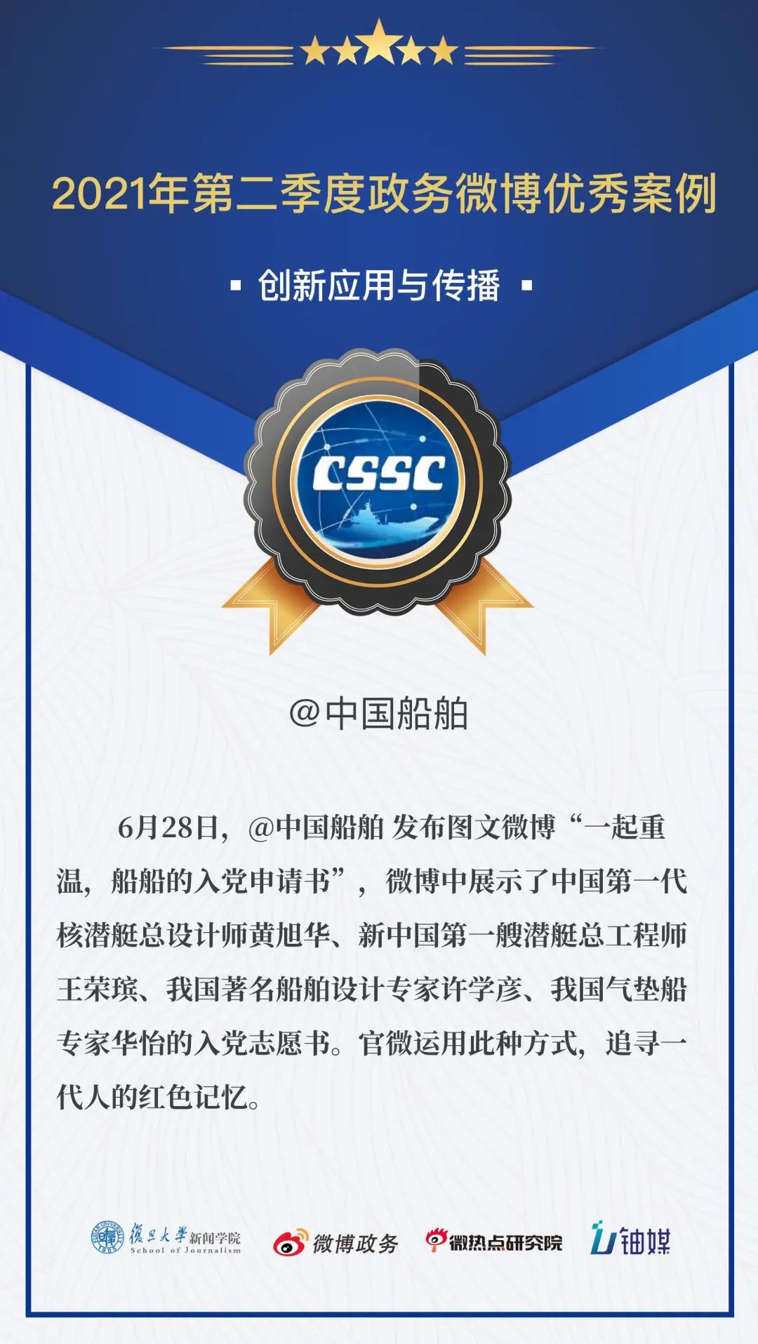 在幾百個(gè)微博政務(wù)賬號(hào)、幾千個(gè)微博政務(wù)優(yōu)秀案例的評(píng)選中,@中國(guó)船舶 憑借圖文微博“一起重溫,船船的入黨申請(qǐng)書(shū)”,再一次拿下“創(chuàng)新應(yīng)用與傳播”的獎(jiǎng)勵(lì),真的是太棒了!