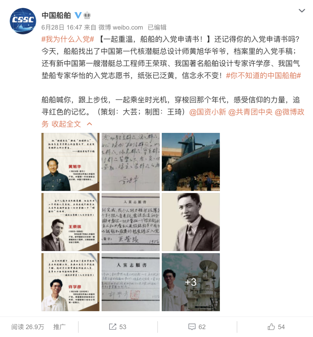 這篇微博展示了中國(guó)第一代核潛艇總設(shè)計(jì)師黃旭華、新中國(guó)第一艘潛艇總工程師王榮瑸、我國(guó)著名船舶設(shè)計(jì)專(zhuān)家許學(xué)彥、我國(guó)氣墊船專(zhuān)家華怡的親筆入黨志愿書(shū),用一種時(shí)空穿越的方式,追尋一代人的紅色記憶,用船舶人的方式,慶祝建黨百年。