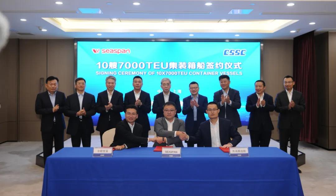 近日,中國船舶集團(tuán)旗下外高橋造船聯(lián)合中船貿(mào)易與加拿大Seaspan公司10艘7000TEU集裝箱船建造合同簽約儀式在上海舉行。中國船舶集團(tuán)黨組書記、董事長雷凡培出席儀式并見證簽約,并與ATLAS集團(tuán)總裁、首席執(zhí)行官、Seaspan公司董事長陳兵進(jìn)行會談。雙方就進(jìn)一步加強(qiáng)交流溝通、擴(kuò)大項(xiàng)目合作進(jìn)行了深入探討并達(dá)成廣泛共識。中國船舶集團(tuán)黨組成員、副總經(jīng)理孫偉參加上述活動。