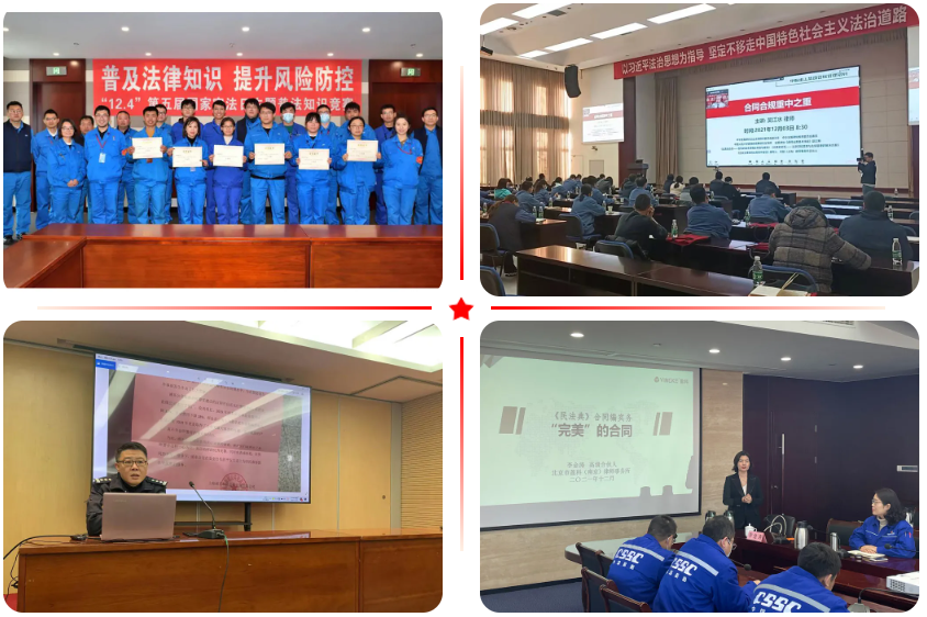 ▲ 江南造船、中船九院、重齒公司、河柴重工、江淮重工、七〇八所、七〇九所、七一六所等單位通過線上與線下相結(jié)合的方式開展法律知識競賽;七一七所、七二二所等單位拍攝制作普法微視頻;中船澄西、中船財務(wù)、中船投資、物資公司、各平臺型上市公司、中船綠洲、中船風(fēng)電、漢光重工、長江科技、七一〇所、七一一所、上船院等多家單位舉辦專題法治講座;七六〇所舉辦民法典熱點問題交流沙龍;八院組織業(yè)務(wù)部門重點崗位人員旁聽庭審。