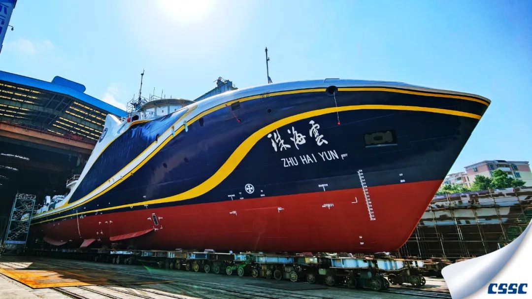 黃埔文沖建造的全球首艘智能型無人系統(tǒng)科考船“珠海云”號(hào)下水。這科幻的外表又似一頭巨大的鯨魚躍出海面。