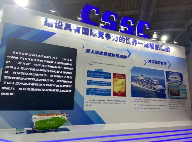 在重大科技專項工程展區(qū),中國船舶集團集中展示了在深??茖W(xué)研究和海洋資源開發(fā)領(lǐng)域深化實施的“蛟龍”號、“深海勇士”號、“奮斗者”號三型載人深潛裝備等一批重大科技專項工程,以及取得的突破性、標(biāo)志性的成果。其中,展會現(xiàn)場展示的“奮斗者”號創(chuàng)造了10909米的中國載人深潛深度紀(jì)錄。