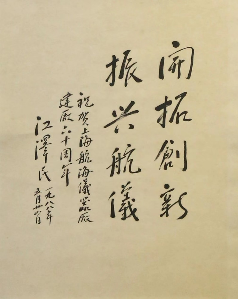 江澤民同志曾給系統(tǒng)工程研究院、中船電科旗下中船航海題詞。1988年5月,為慶祝上海航海儀器廠建廠60周年,江澤民同志寫(xiě)下“開(kāi)拓創(chuàng)新,振興航儀”以示祝賀。