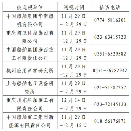 根據(jù)中國船舶集團(tuán)黨組2023年第二輪巡視工作部署,截至2023年11月29日,巡視工作已經(jīng)鋪開。其中,對中國船舶集團(tuán)華南船機有限公司、重慶前衛(wèi)科技集團(tuán)有限公司、中國船舶集團(tuán)汾西重工有限責(zé)任公司、杭州應(yīng)用聲學(xué)研究所、上海船舶電子設(shè)備研究所等5家單位開展常規(guī)巡視,對重慶川東船舶重工有限責(zé)任公司、中國船舶重工集團(tuán)新能源有限責(zé)任公司等2家單位開展專項巡視。