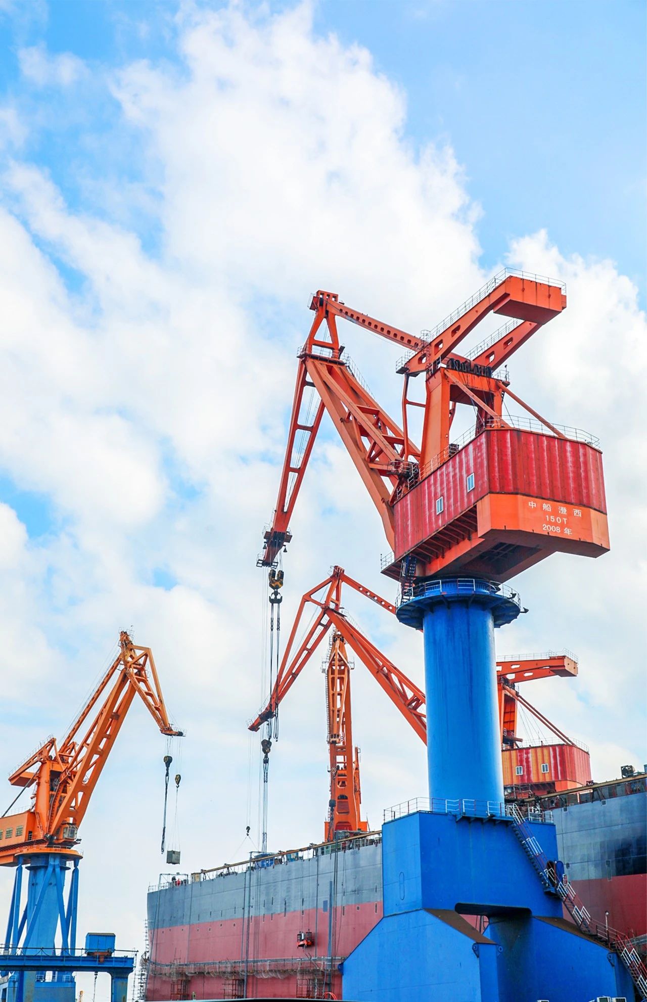 本幅作品拍攝于中船澄西主建船型82000噸散貨船船臺搭載過程中,高矮錯(cuò)落的吊臂構(gòu)成了如音符一般的工作樂潮。