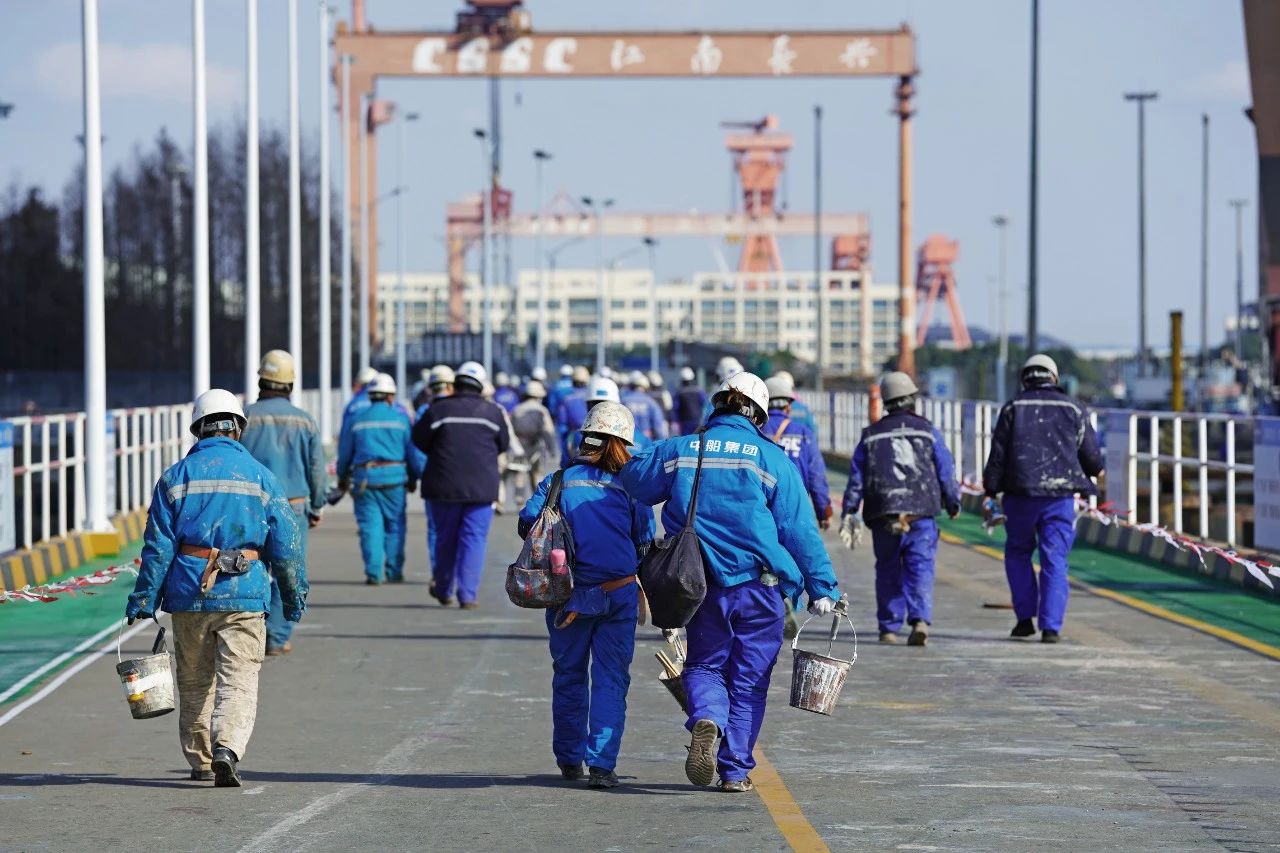 在碼頭上,午休時(shí)間,一線工人拎著工作工具,互相交談著,亦或是搭著肩膀,一起下班。