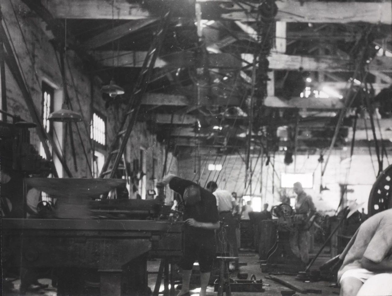 1934年武漢,上世紀30年代,武昌造船成立之初,工人們以手工作業(yè)“敲敲打打”形式開展修造船業(yè)務。修造的船只大多為100~300噸、鋼肋骨與木殼結構,僅有少量是鋼鉚接船體。建造的船只只能在長江上航行跑跑運輸。為了生存和救國,船廠還建造一些農(nóng)用機械器具、槍支,以輔助民生、支援抗日。