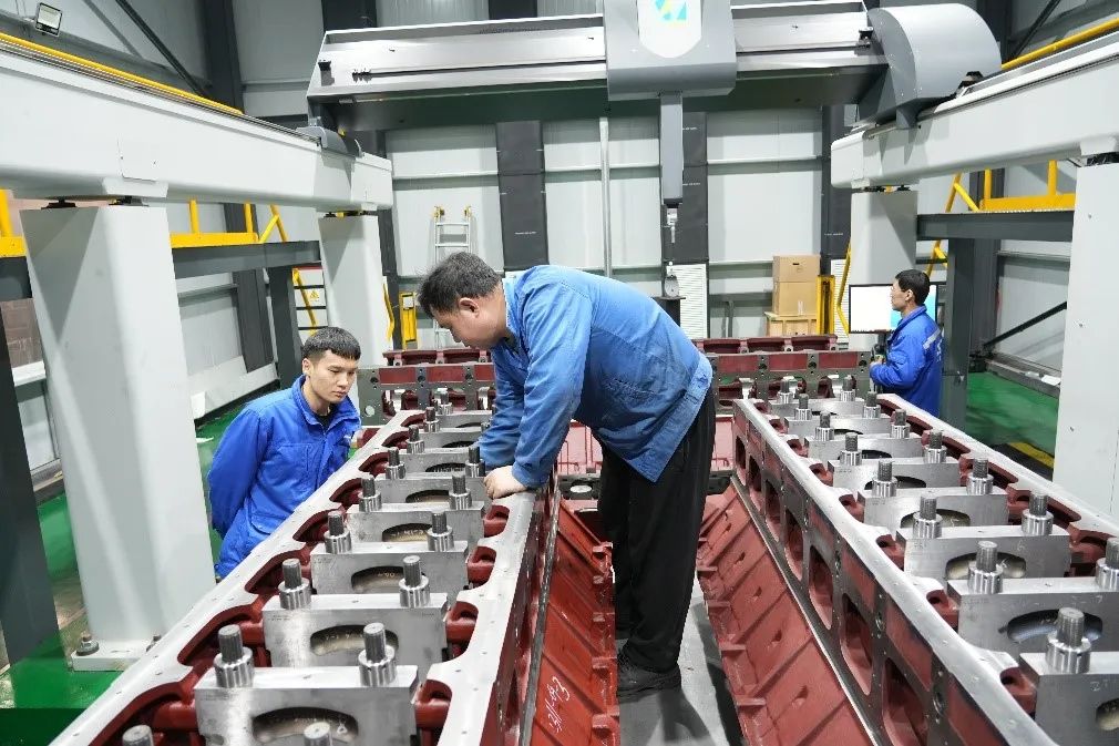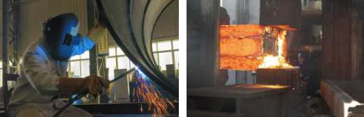 施工現(xiàn)場焊花飛舞、壓機轟鳴