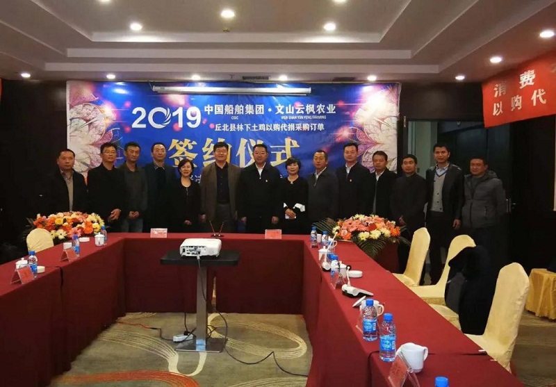 2019年12月22日,中國船舶集團-云南文山云楓農業(yè)丘北縣林下養(yǎng)雞“以購代捐”采購訂單簽約儀式在云南丘北縣舉行。