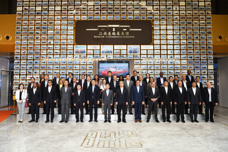 使節(jié)代表團(tuán)先后參觀了中國(guó)船舶集團(tuán)旗下滬東中華、江南造船,聽(tīng)取了兩家企業(yè)重點(diǎn)產(chǎn)品、經(jīng)營(yíng)生產(chǎn)發(fā)展的總體介紹,并赴船塢、碼頭實(shí)地了解了在建的目前全球最大雙燃料23000TEU集裝箱船以及其他高技術(shù)、高附加值船舶建造情況。