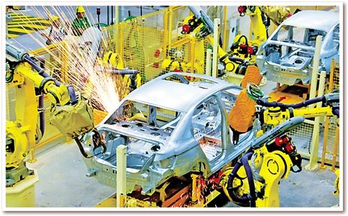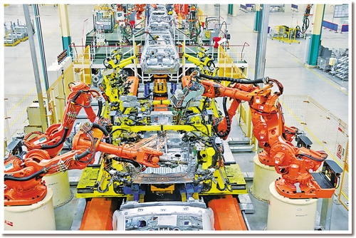 日前,記者在東風(fēng)汽車公司旗下神龍汽車公司成都工廠焊裝車間看到,占地面積約10個(gè)足球場(chǎng)的車間儼然就是一個(gè)“機(jī)器人王國(guó)”:442臺(tái)各種機(jī)器人都在忙碌著,所有點(diǎn)焊、弧焊、激光焊、螺柱焊、涂膠、包邊、鉚接、部件搬運(yùn)等“重活、累活”全部由機(jī)器人自動(dòng)完成。焊裝分廠廠長(zhǎng)孫繼勝介紹說(shuō),除442臺(tái)機(jī)器人外,車間還有另外一個(gè)“撒手锏”??六面體轉(zhuǎn)臺(tái)設(shè)備?!霸瓉?lái)生產(chǎn)1個(gè)車型要建6條生產(chǎn)線,現(xiàn)在1條生產(chǎn)線就可以生產(chǎn)6種車型?!睂O繼勝說(shuō)。