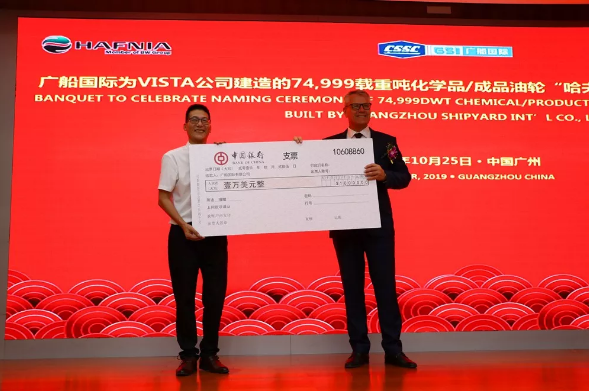 10月25日,廣船國(guó)際有限公司為VISTA公司建造的7.5萬(wàn)噸化學(xué)品/成品油船4號(hào)船命名交付。這是廣船國(guó)際在“決戰(zhàn)120天,掀起生產(chǎn)高潮”勞動(dòng)競(jìng)賽中收獲的又一枚勝利果實(shí)。該船比合同交船期提前43天交付,船東為此專(zhuān)門(mén)獎(jiǎng)勵(lì)廣船國(guó)際1萬(wàn)美元。