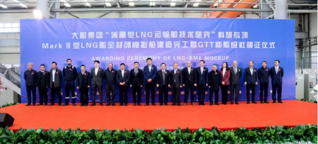 ????2019年11月26日,大船集團(tuán)舉行“薄膜型LNG運(yùn)輸船技術(shù)研究”科研專項(xiàng)MarkⅢ型LNG船全封閉模擬艙建造完工暨GTT和船級社頒證儀式。法國GTT公司、英國勞式船級社和中國船級社代表在模擬艙建造現(xiàn)場向大船集團(tuán)代表頒發(fā)證書。
