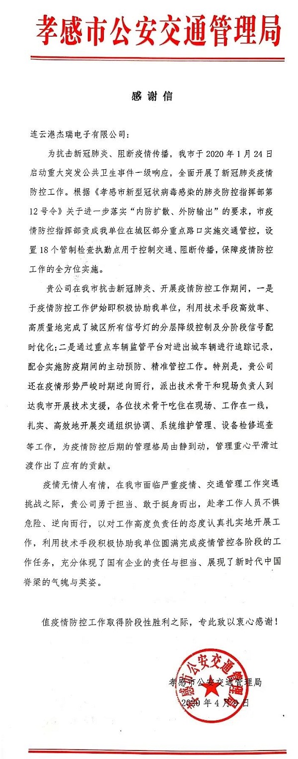 ????中國(guó)船舶集團(tuán)七一六所下屬杰瑞電子公司收到湖北省孝感市公安交通管理局發(fā)來(lái)的感謝信,對(duì)杰瑞電子赴孝感工作人員不懼危險(xiǎn)、逆向而行,以高度負(fù)責(zé)任的態(tài)度,利用技術(shù)手段,積極協(xié)助疫情防控工作表示感謝。
