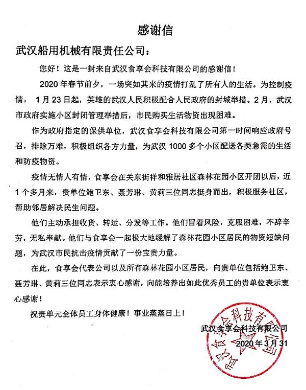 ????中國(guó)船舶集團(tuán)旗下武漢船機(jī),收到武漢食享會(huì)科技公司發(fā)來(lái)的感謝信,信中對(duì)武漢船機(jī)員工挺身而出,主動(dòng)擔(dān)任武漢社區(qū)志愿者不畏艱險(xiǎn)、無(wú)私奉獻(xiàn),為抗擊疫情貢獻(xiàn)力量表示敬佩和感謝。