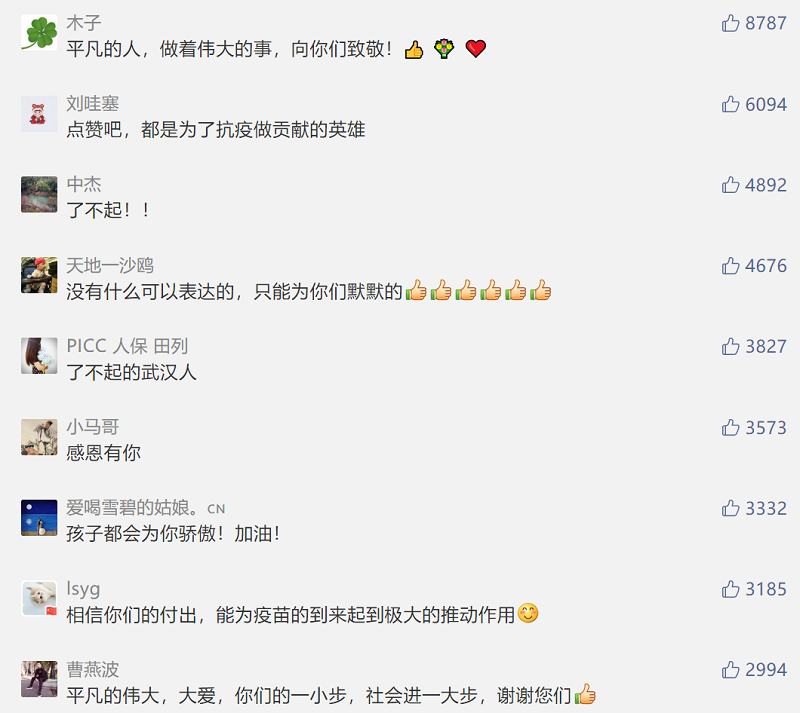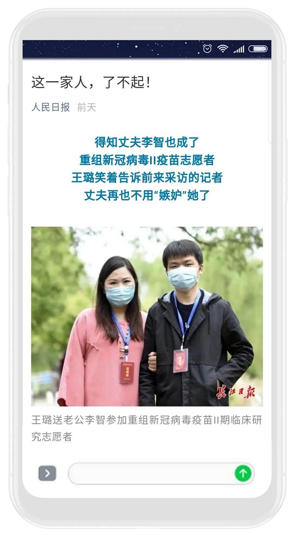 ????4月18日,人民日報微信公眾號推送了這樣一條消息,詳細介紹了一位土生土長的武漢人王璐及其家人自愿報名接種新冠疫苗的事跡,消息收獲了10萬+的閱讀量與3.2萬的“在看” ,還有動輒幾千的留言點贊!這位女主角王璐來自中國船舶集團七一七所,不同于第一批結(jié)束醫(yī)學(xué)觀察的志愿者,王璐所在組的年齡在20歲到50歲,是最早一批高劑量的接種者。
