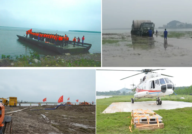 ????在搜救環(huán)節(jié),中船應(yīng)急搶險(xiǎn)隊(duì)架設(shè)動(dòng)力舟橋和硬質(zhì)機(jī)動(dòng)路面進(jìn)行道路搶通,保障重型裝備及人員進(jìn)場;在內(nèi)澇搶排環(huán)節(jié),采用應(yīng)急泄流虹吸裝備和履帶式排澇機(jī)器人參與排澇搶險(xiǎn);在重大險(xiǎn)情處置環(huán)節(jié),鋪設(shè)應(yīng)急直升機(jī)停機(jī)坪保障直升機(jī)起降,并實(shí)施潰口封堵作業(yè)。