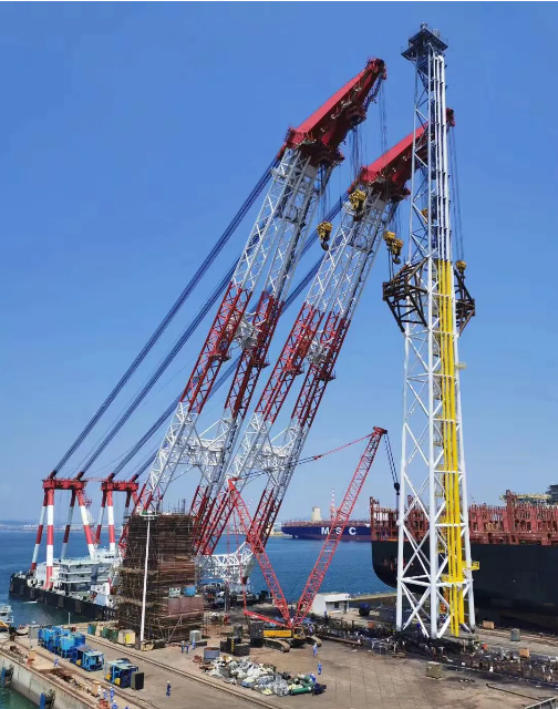 7月7日,世界最大FPSO火炬塔即MV31 FPSO火炬塔在中國船舶集團旗下大船集團成功吊裝。MV31 FPSO火炬塔自身總重595噸,總高度140米。由于受到海吊尺寸及吊重能力的限制,經(jīng)過反復論證,項目組決定將火炬塔分成兩個半段吊裝,其中上段高度達120米,需要整體翻身吊裝。