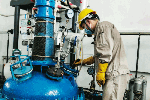 在原料藥車間,七一六所杰瑞藥業(yè)員工細心查看反應(yīng)釜內(nèi)物料反應(yīng)情況。此時釜內(nèi)溫度高達124.8℃,近身溫度超過50℃,全程反應(yīng)時間約3~4小時。