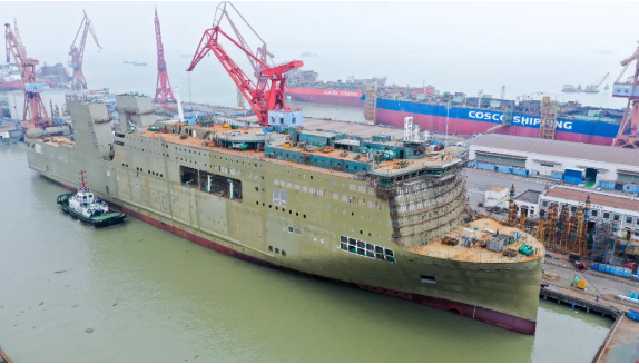 全船共26個(gè)總段中23個(gè)總段的總組和13個(gè)總段的涂裝。這艘船完成了所有上建外板的一度油漆和窗戶涂裝,升降臺、斜坡水密門、斜坡蓋板等均已完成安裝發(fā)電機(jī)完成安裝報(bào)驗(yàn),多個(gè)系統(tǒng)完成調(diào)試報(bào)驗(yàn)