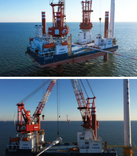 中國船舶集團建造的“中船海工101”號風電安裝平臺正在海上作業(yè)
