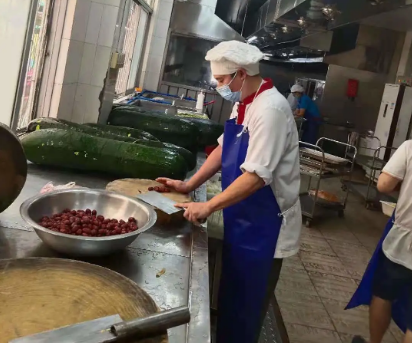 而在技校和養(yǎng)老院的后廚,阮積劍等廚師們同樣已經(jīng)整裝待發(fā)。在社區(qū)封閉初期,飲食服務(wù)部養(yǎng)老院飯?zhí)脝T工由原來的18人劇減至7人。廚師梁志寬面對(duì)每日約800人的進(jìn)餐人數(shù),迎難而上,轉(zhuǎn)變菜式花樣,合理優(yōu)化膳食,注重營養(yǎng)搭配,以嫻熟的廚藝獨(dú)自完成后廚大量工作,保證了菜肴準(zhǔn)時(shí)出品。而廚師、黨員陳兆銘得知飯?zhí)靡蚴芤咔橛绊懚耸謬?yán)重不足,在試航歸來做完核酸檢測(cè)后立即回到養(yǎng)老院飯?zhí)玫膷徫簧?。為此,他直接把“家”安在了養(yǎng)老院,每天睡在簡(jiǎn)易折疊床上。