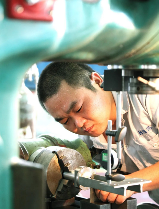七〇八所海迅公司生產(chǎn)部的員工計(jì)師傅雖已汗如雨下,仍專注于銑床加工之中。