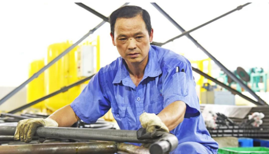 高壓油管車(chē)間,汗流浹背的操作工人正在操作彎管機(jī)加工高壓油管。