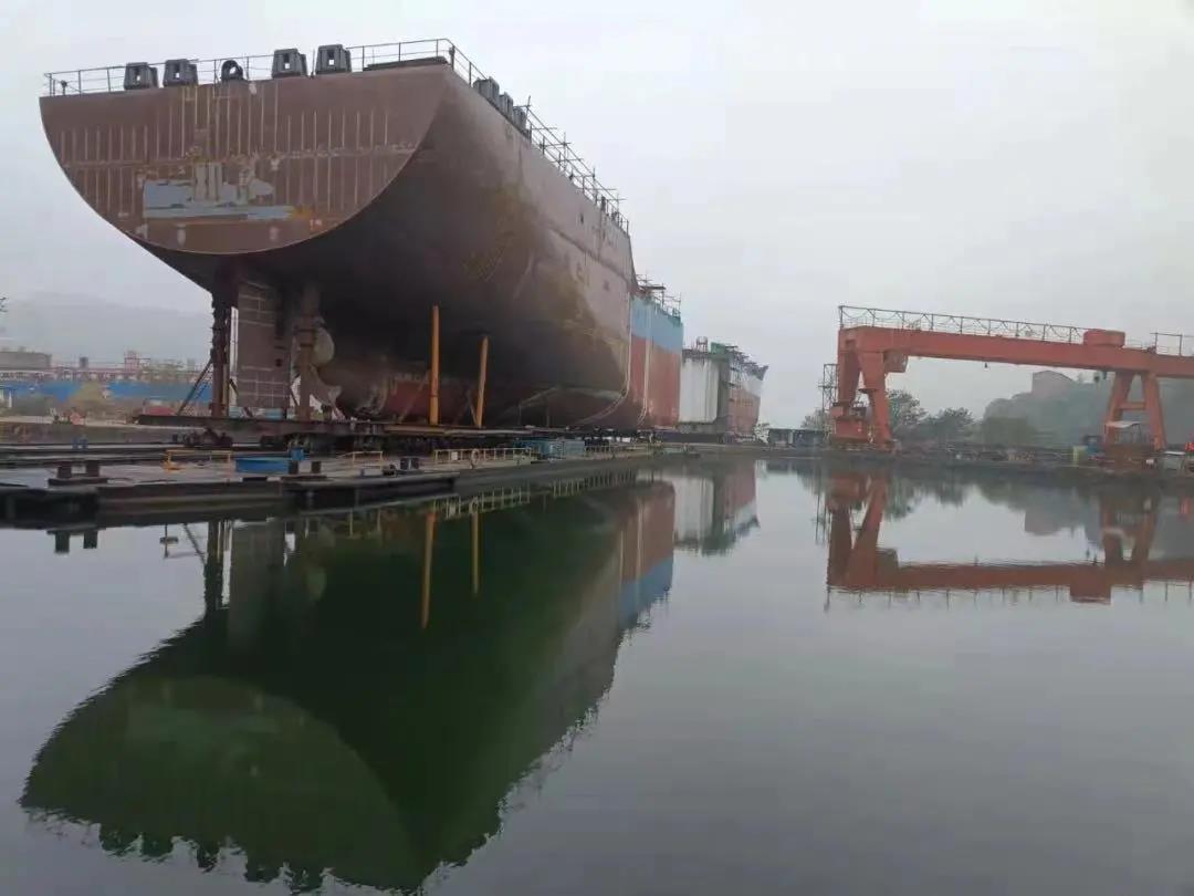 該公司在建的8000噸不銹鋼化學(xué)品船1號船艉總段拖移到位。