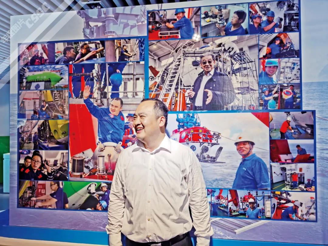 國(guó)企開放日期間, “奮斗者”號(hào)總設(shè)計(jì)師葉聰帶領(lǐng)眾多央媒記者走進(jìn)中國(guó)船舶、深入船人一線,感受大國(guó)重器的張力!在展覽室的背景墻前,他縱然一笑,撒下江湖傳說。