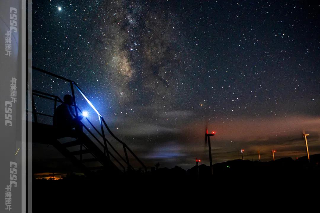 星幕下,中國(guó)船舶人在重慶中國(guó)海裝南天門風(fēng)電場(chǎng)的漫天星空下,仰望星空,看著風(fēng)機(jī)上的航空燈和璀璨的星河遙相呼應(yīng),這一切簡(jiǎn)直美得妙不可言!