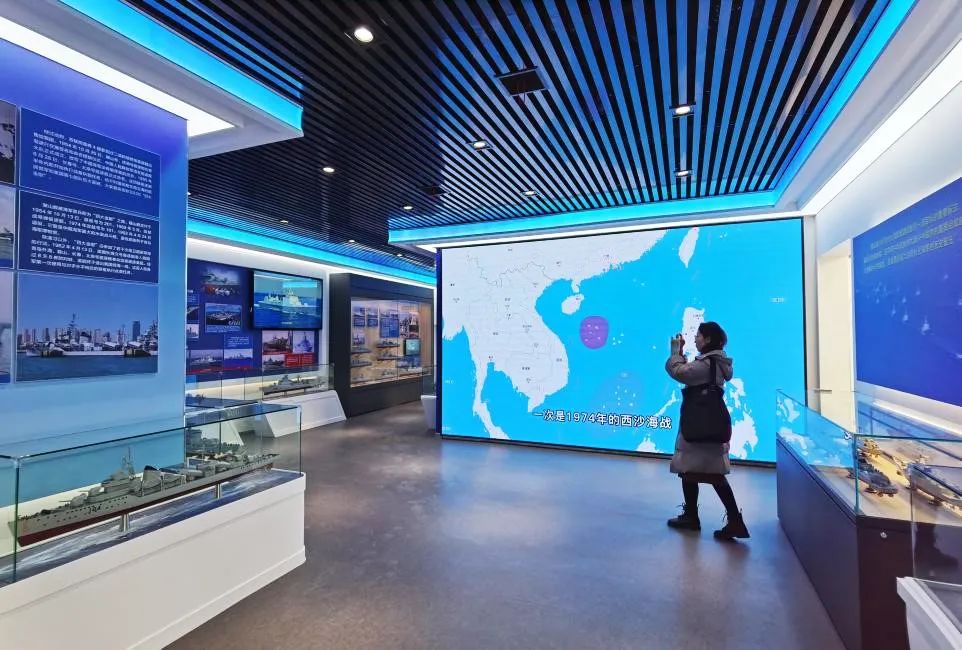 由中國船舶七一四所設(shè)計施工的艦船打卡地,有著10米長的大型長沙艦?zāi)P?,重達8.75噸的船錨昂首挺立,45艘包括航母、核潛艇、驅(qū)逐艦、護衛(wèi)艦在內(nèi)的各型艦船武器模型,200多幅圖片文字,為觀眾展示了近代以來海軍裝備波瀾壯闊的發(fā)展歷程。