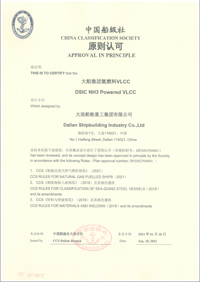 2020年,大船集團(tuán)研發(fā)的液氨動(dòng)力超大型油船(VLCC)分別取得美國船級(jí)社(ABS)和中國船級(jí)社(CCS)頒發(fā)的AIP證書。