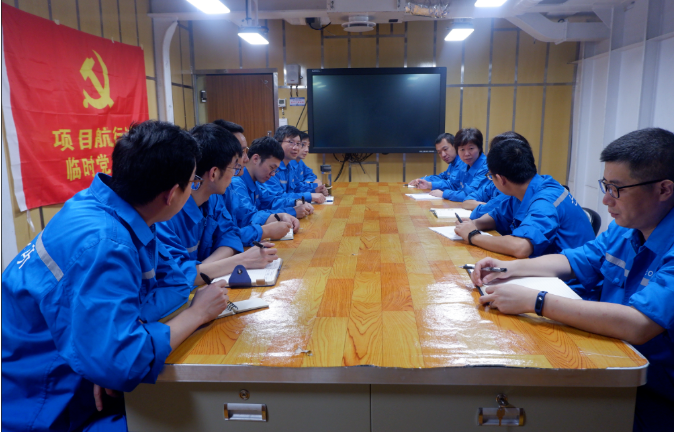 毛獻(xiàn)群在艦上同項目組成員一起討論技術(shù)問題