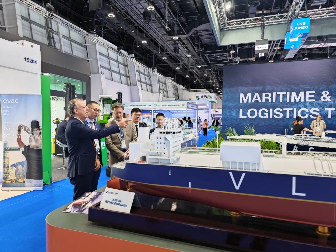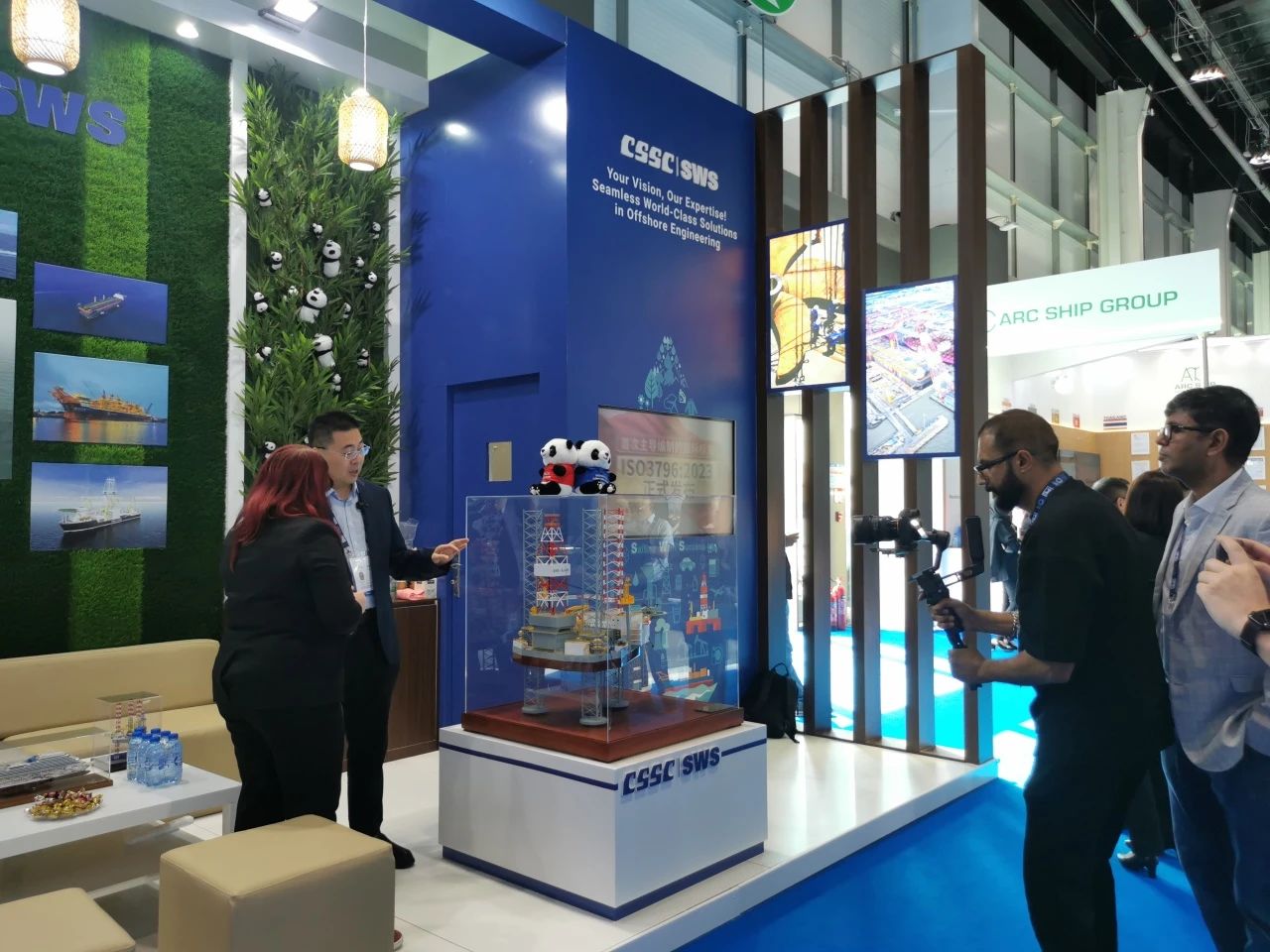 在此次展會上,江南造船展出了自主研發(fā)設計的17.5萬立方米液化天然氣(LNG)運輸船、目前世界上最大艙容的99000立方米超大型乙烷運輸船(VLEC)以及93000立方米超大型液氨運輸船(VLAC)等船型,憑借自身優(yōu)勢及特色展臺布置吸引了眾多油氣公司、船東、船級社、中間商、船廠、供應商等駐足觀看,同時也與其進行了廣泛和深入的交流。值得一提的是,中國駐阿聯(lián)酋大使一行也到訪江南造船展臺,詳細詢問江南造船的產品特點、技術和建造優(yōu)勢。