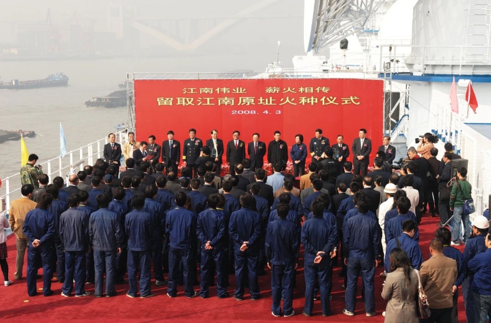2008年4月,江南造船老廠建造的最后一艘船“遠(yuǎn)望6”號(hào)航天測量船即將交付。4月3日,時(shí)任江南造船搭載部部長黃文飛作為取火者從“遠(yuǎn)望6”號(hào)船前甲板的上建位置手拿焊槍取火引燃火炬?;鹁嬉来蝹鬟f至勞動(dòng)模范、三八紅旗手、江南造船領(lǐng)導(dǎo)等,最后傳至?xí)r任中船集團(tuán)總經(jīng)理陳小津手中并由他點(diǎn)燃了火種盒。6月3日,江南造船人親手建造的船舶特地趕回“娘家”,載著江南“火種”駛往新基地,為新建造的產(chǎn)品開工點(diǎn)火。