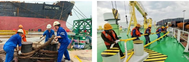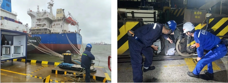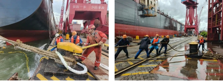 臺風肆虐時,組織管理人員抗臺值守,以“臺風不撤,我們不撤”的原則堅守一線。臺風預警解除后,10小時內完成登船梯搭設及纜繩解除,迅速恢復正常生產。憑借科學預案與堅守,最終實現(xiàn)纜繩零斷裂、船舶零移位,有力保障了生命財產安全。