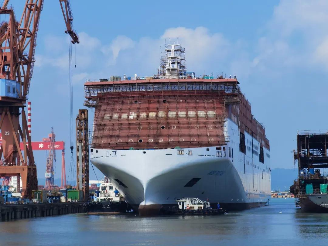 該船實現(xiàn)了出塢前上建亮燈。電纜拉放完成率87.8%,作為全球最大的豪華客滾船,該船全船電纜長度達到了946公里(相當于從廣州到重慶);出塢前已完成了830公里電纜的拉放工作。涂裝完整性實現(xiàn)突破,該船出塢時上層建筑上方仍有部分區(qū)域未完成涂裝? 這是因為該船垂直高度已接近40米,超過了船塢高空車的最大極限。