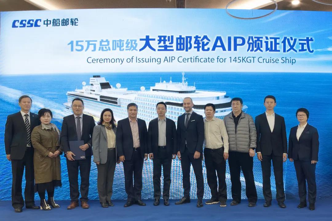 12月9日,中國船舶集團旗下中船郵輪自主研發(fā)設(shè)計的15萬總噸級大型郵輪獲得意大利船級社原則性認可(AIP)證書。這是中國首次獨立自主研發(fā)設(shè)計的完全擁有自主知識產(chǎn)權(quán)的大型郵輪,一舉打破國外在該領(lǐng)域長期技術(shù)封鎖和壟斷,開啟中國大型郵輪自主設(shè)計新時代。中國船舶集團黨組成員、副總經(jīng)理盛紀綱出席授證儀式并講話。