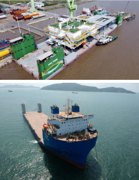通常單一的部件運輸任務(wù)可利用甲板運輸駁船、半潛運輸駁船實現(xiàn)。上船院具有6000~100000載重噸的甲板運輸/半潛船的設(shè)計建造船型。
