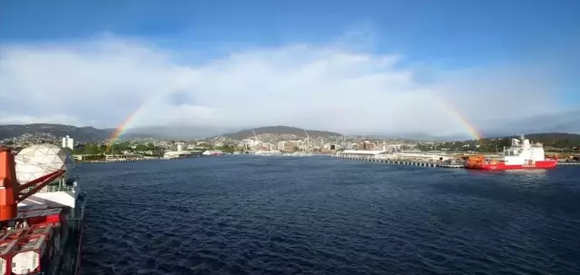 ????當(dāng)?shù)貢r(shí)間11月7日上午,搭載107名中國第36次南極考察隊(duì)員的“雪龍”號(hào)??堪拇罄麃喕舭吞馗劭?,與先行靠港的“雪龍2”號(hào)正式匯合。