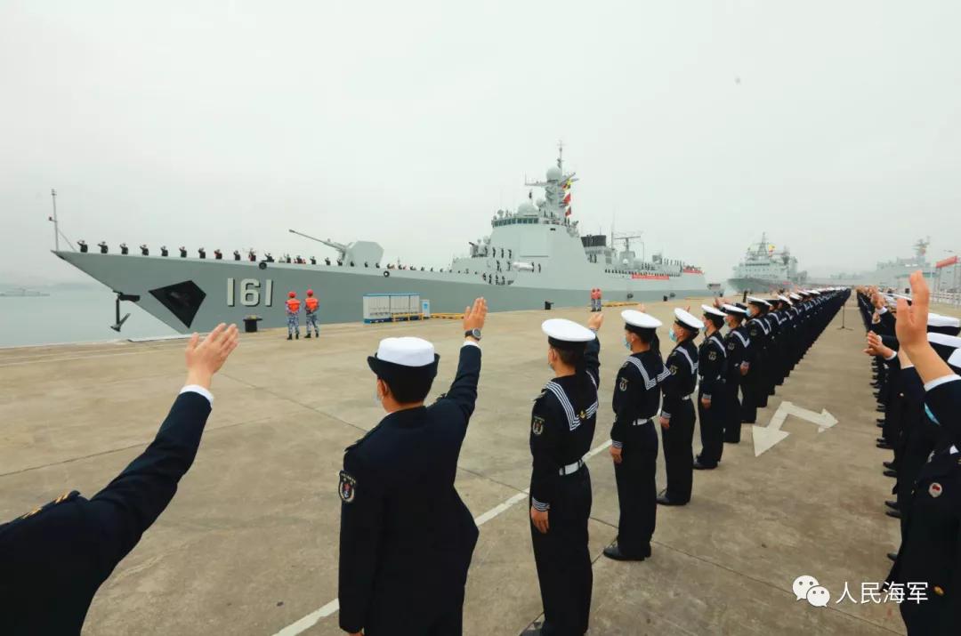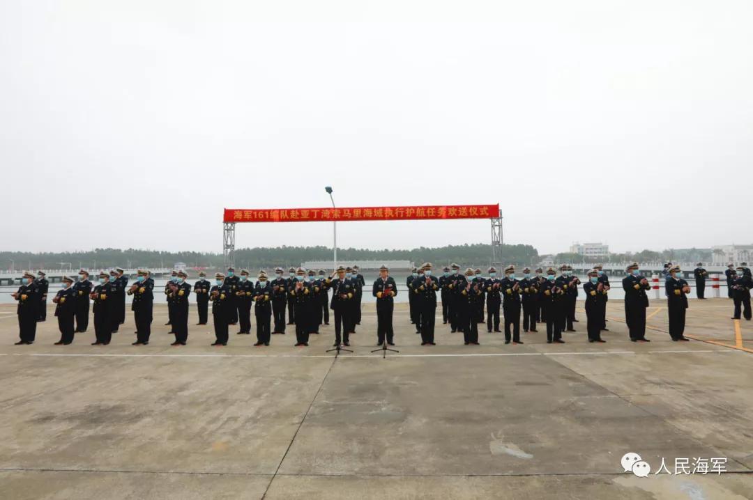 軍樂隊奏響《歡送進行曲》,編隊艦艇依次解纜,緩緩駛離碼頭,任務(wù)官兵整齊列隊、士氣高昂,向祖國和人民揮手告別。
