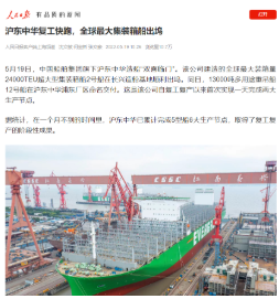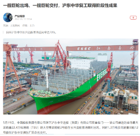 5月19日,中國(guó)船舶集團(tuán)旗下滬東中華雙喜臨門(mén)。其建造的全球最大裝箱量24000TEU超大型集裝箱船2號(hào)船在長(zhǎng)興造船基地順利出塢;建造的13000噸多用途重吊船12號(hào)船在浦東廠區(qū)命名交付,標(biāo)志著該項(xiàng)目圓滿收官。這是滬東中華自復(fù)工復(fù)產(chǎn)以來(lái)首次實(shí)現(xiàn)一天完成兩大生產(chǎn)節(jié)點(diǎn)。