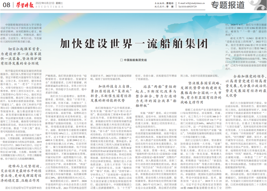6月22日,《學習時報》發(fā)表中國船舶集團黨組署名文章《加快建設世界一流船舶集團》,萬山磅礴看主峰,大潮奔涌好揚帆,面向新征程,中國船舶集團將踔厲奮發(fā)、勇毅前行,為發(fā)展壯大國有經濟貢獻更大力量,以優(yōu)異成績迎接黨的二十大勝利召開。