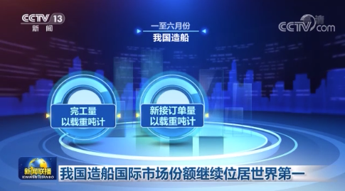 7月17日,央視《新聞聯(lián)播》對我國造船國際市場份額繼續(xù)位居世界第一進(jìn)行了報(bào)道。數(shù)據(jù)顯示,一至六月份,我國造船完工量、新接訂單量、手持訂單量,以載重噸計(jì)分別占世界總量的45.2%、50.8%和47.8%,國際市場份額繼續(xù)位居世界第一。