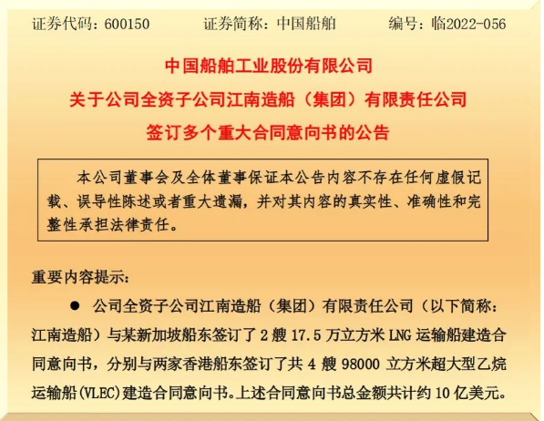 10月25日,中國(guó)船舶集團(tuán)有限公司旗下上市公司中國(guó)船舶工業(yè)股份有限公司發(fā)布《關(guān)于公司全資子公司江南造船(集團(tuán))有限責(zé)任公司簽訂多個(gè)重大合同意向書》的公告。根據(jù)公告,江南造船共與相關(guān)船東簽署了2型6艘約10億美元新船建造合同意向書。