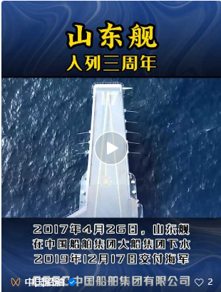 山東艦是我國(guó)第二艘航空母艦,也是我國(guó)自主設(shè)計(jì)、自主配套、自主建造的首艘航母。2017年4月26日,山東艦在素有“海軍艦艇搖籃”美譽(yù)的中國(guó)船舶集團(tuán)旗下大船集團(tuán)碼頭下水,自此揭開(kāi)了中國(guó)雙航母時(shí)代篇章。